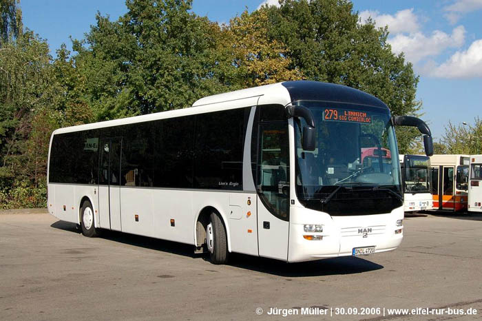 Bei Lövenich-Reisen aus Niederzier wurde vor einigen Wochen ein MAN R12 (ÜL 314 Lion's Regio) beschafft. Der Bus erhielt das Kennzeichen DN-L 4720 und kommt im Linienverkehr der RVE Regionalverkehr Euregio Rhein-Maas GmbH zum Einsatz. Ausgemustert wurde im Gegenzug der Setra S 215 SL mit dem Kennzeichen DN-L 208. Das Foto von Jürgen Müller zeigt den Neuzugang am 30.09.2006 auf dem Betriebshof in Niederzier-Huchem-Stammeln.