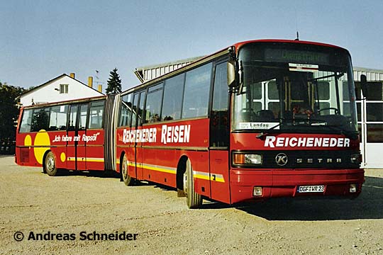 Ein gebrauchter Setra SG 221 UL ersetzt einen Mercedes-Benz O 305 im Fuhrpark der Firma Reicheneder in Wallersdorf. Der Gelenkbus wurde am 03.08.1998 zum ersten Mal zugelassen, und zwar von der Firma Müller & Co., Gelchsheim. Später übernahm in die Firma Hammer am gleichen Ort (WÜ-HC 89). Danach kam er dann zu MBB Meiningen (SM-B 851, dort wurde er u.a. im Mai 2004 gesichtet), bevor er bei Reicheneder auf DGF-WR 23 zugelassen wurde.