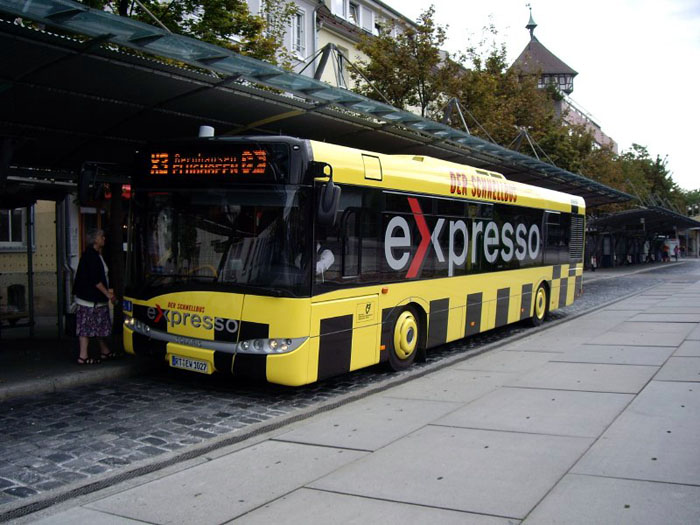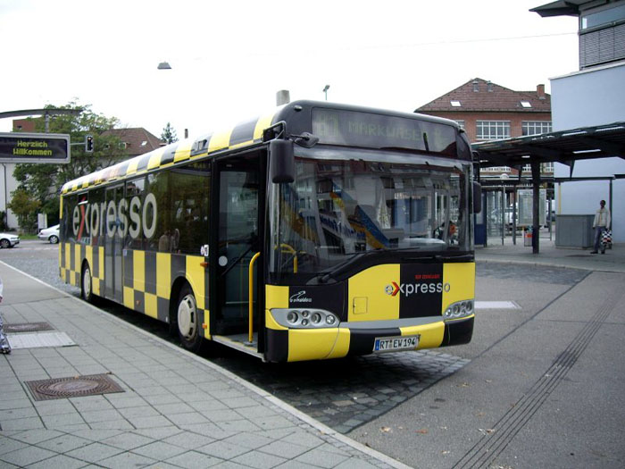 Die zwei neuen Solaris Urbino 12 Flughafenbusse der Reutlinger Stadtverkehrsgesellschaft mbH Hogenmüller & Kull Co. (RSV) sind jetzt beschriftet und angemeldet unter RT-EW 1027 und 1028. Das Bild zeigt den Wagen RT-EW 1027 beim Linieneinsatz auf der Schnellbuslinie X3 am 02.10.2006 am ZOB in Reutlingen. Von den bisherigen Flughafenbussen verkehrt der Wagen RT-EW 194 jetzt im Stadtverkehr Reutlingen und RT-EW 195 steht als Reservefahrzeug auf der Linie X3 zur Verfügung. In der Aufnahme ist der RT-EW 194 im Stadtverkehr auf der Linie 81 ebenfalls am ZOB in Reutlingen zu sehen.