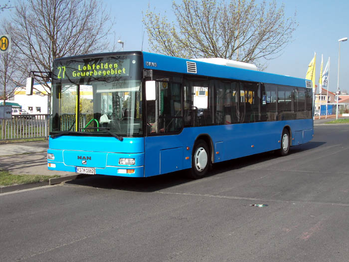 Die Firma Henze Reisen aus Fuldatal hat zwei gebrauchte Niederflurbusse in Dienst gestellt. Ein MAN A21 (NL 263), der ursprünglich bei der Firma Ecker Steinsel in Luxemburg als Wagen 3262 im Einsatz stand, wurde auf das Kennzeichen KS-H 1863 zugelassen und gelangt montags bis freitags auf der Linie 27 der Kasseler Verkehrsgesellschaft zum Einsatz. Die Zulassung KS-H 2368 erhielt ein Neoplan N 4016, der zuvor bei Lücke-Reisen in Nordkirchen-Capelle eingesetzt wurde. Die Aufnahme zeigt den MAN-Niederflurbus an der Endhaltestelle Justus-Liebig-Straße der Linie 27.