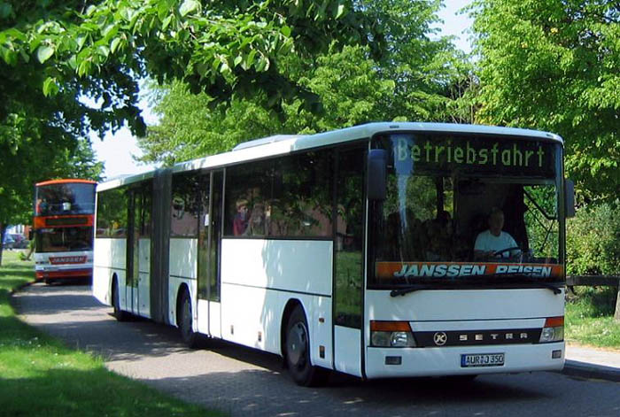 Janssen Reisen aus Wittmund hat zwei ältere Gelenkzüge verkauft: Einen Setra SG 180 SL (WTM-J 132) und einen Setra SG 219 SL. Als Ersatz wurde ein weißer Setra SG 321 UL mit dem Kennzeichen AUR-J 350 beschafft. Die Aufnahmen zeigen von links nach rechts die beiden ausgemusterten sowie das neue Fahrzeug.