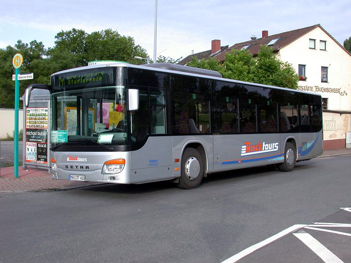 Seit Anfang Juni setzt die Firma Racktours aus Erlensee bei Hanau einen neuen EvoBus Setra S 415 NF im Linienverkehr ein. Der Niederflurbus mit Euro 5-Motor verfügt über Klimaanlage, Kameras zur Innenraumüberwachung und erstmals für die Fa. Racktours über eine Konferenzbestuhlung im Heck. Das Fahrzeug wurde auf MKK-RT 400 zugelassen und ergänzt den vorhandenen Fuhrpark. Im Herbst wird dafür ein noch zu bestimmender Linienwagen die Flotte verlassen. Das Bild vom 24.06.2007 zeigt den neuen Setra an der Haltestelle Gablonzer Straße in Frankfurt, wo er am Wochenende im Schienenersatzverkehr für die Strassenbahnlinie 14 zwischen Frankfurt-Louisa und Neu-Isenburg eingesetzt wurde.
