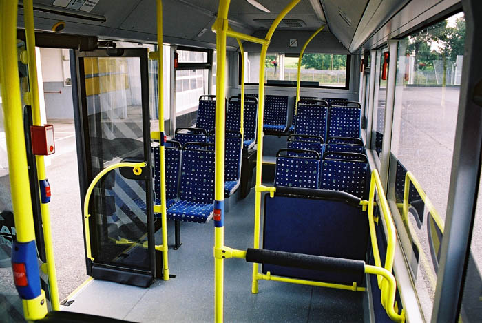 zu sehen. Die Bilder von Edgar Mundle zeigen den Bus ohne Anhänger an seinem ersten Einsatztag, dem 06.08.2007, an der Haltestelle "Stiftsberg" in Neckarsulm sowie die Innenansicht des Anhängers.