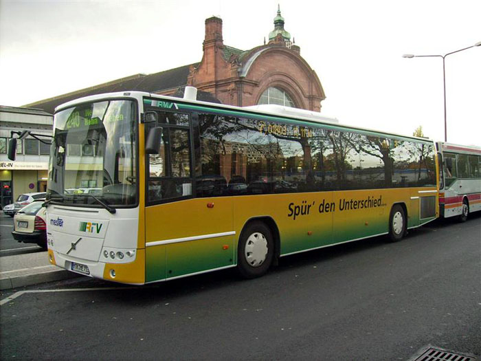 Die Firma Autobus Mester aus Eppstein im Main-Taunus-Kreis übernahm vor etwa drei Wochen einen Volvo 8700 LE Vorführwagen und beklebten ihn mit Werbung für die Rheingau-Taunus-Verkehrsgesellschaft. Das Fahrzeug trägt die Wagennummer 33 und wurde auf das Kennzeichen MTK-ME 733 zugelassen. Der Wagen kommt auf Linien der Rheingau-Taunus-Verkehrsgesellschaft zum Einsatz. Das Fahrzeug war seit Juli 2007 testweise bei Mester im Einsatz und trug bis zur Übernahme das Kennzeichen HN-V 8702. Das Foto zeigt den Wagen 33 am 30.10.2007 am Hauptbahnhof in Wiesbaden.