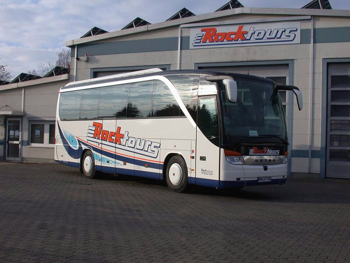Die Firma Racktours aus Erlensee bei Hanau konnte in der letzten Oktoberwoche in Ulm ihren neuen Reisebus abholen. Es handelt sich hierbei um einen EvoBus Setra S 411 HD in 4-Sterne Komplettausstattung mit Küche, WC und CD/DVD-Anlage. Das im linken Bild zu sehende Fahrzeug wurde auf MKK-RT 500 zugelassen und verstärkt die Reisebusflotte auf nun sechs Fahrzeuge.