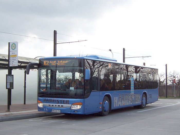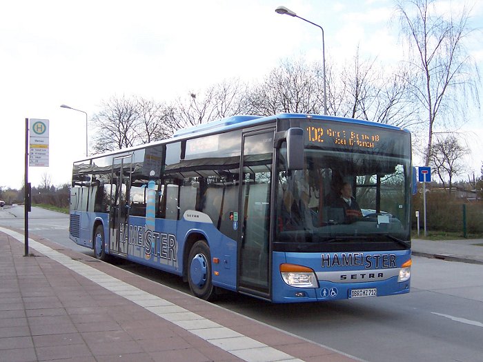 Die Hameister Personenverkehr GmbH mit Sitz in Stäbelow bei Rostock nahm im Dezember 2007 einen werksneuen, zweitürigen Setra S 415 NF in Betrieb. Der 12 Meter lange Bus ist mit LED-Fahrtzielanzeigern, automatischer Haltestellenansage und -Anzeige sowie einer Dachklimaanlage ausgestattet. Der 299 PS starke Mercedes-Motor erfüllt die Euro 4-Abgasnorm mit der Abgasnachbehandlungsmethode Bluetec. Dabei wird in die entstehenden Abgase ein Harnstoff (AdBlue) eingespritzt, der unter dem Ablauf chemischer Reaktionen den Schadstoffausstoß senkt und als Reaktionsprodukte nur Stickstoff und Wasser bildet. Mit der Anschaffung dieses Fahrzeuges hält zum ersten Mal seit Betriebsgründung ein Niederflurfahrzeug Einzug in den Fuhrpark. Die beiden Aufnahmen zeigen den auf DBR-HZ 712 zugelassenen Bus an der Haltestelle "Mensa" in Rostock.