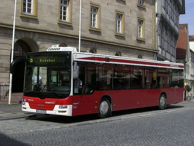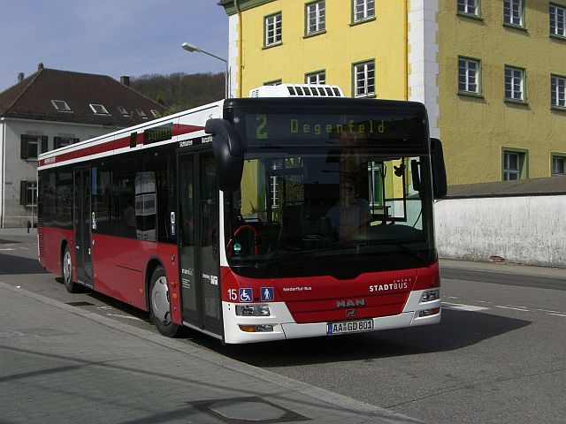 Die Stadtbus Gmünd Severin Abt GmbH & Co. KG, die den Stadt- und Vorortverkehr in Schwäbisch Gmünd im Ostalbkreis bedient, hat bereits im Januar fünf MAN A21 (NL 313 Lion's City) in Dienst gestellt. Nach Jahrzehnten sind dies wieder die ersten Fahrzeuge aus dem Hause MAN für das mittelständische Unternehmen. Die Neufahrzeuge erhielten die Nummern 15, 17, 21, 40 und 42 und in dieser Reihenfolge die Kennzeichen AA-GD 801 bis 805. Die Bilder zeigen den Wagen 15 am Bahnhof und den Wagen 17 am Marktplatz von Schwäbisch Gmünd, beide aufgenommen am 27.04.2008.