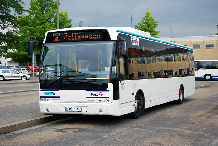Seit 2007 ist auch der britische Verkehrskonzern First auf dem deutschen Markt aktiv. Zum Einstieg kaufte man das alteingesessene Unternehmen Auto Merl aus Speyer. Unterdessen hat man seine Aktivitäten bereits in Richtung Rhein-Main-Verkehrsverbund ausgeweitet und betreibt seit Februar zwei Linienbündel im Landkreis Offenbach. Das Foto vom 18.06.2009 zeigt den Wagen SP-OF 66, einen VDL-Berkhof Ambassador 120, am Hauptbahnhof in Hanau.