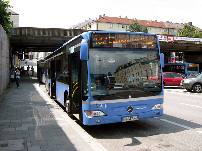 Die Firma Baumann in München hat Anfang Juli sechs neue EvoBus MB O 530 (Citaro) erhalten. Die dreitürigen Fahrzeuge kommen im Auftrag der Münchner Verkehrsgesellschaft mbH zum Einsatz. Die Aufnahme zeigt den Wagen mit dem Kennzeichen M-JJ 7322.