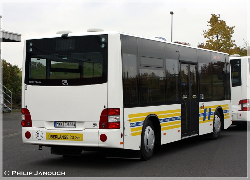 Mitte August dieses Jahres konnte die Langenselbolder Firma Heuser ihren ersten Buszug und zugleich den ersten Midi-Train im Main-Kinzig-Kreis (MKK) in Empfang nehmen. Bei dem 20,3 Meter langen Gespann, welches sich aus einem MAN A35 (NM 283.3 Lion’s City) mit einer Länge von 10,3 Meter und einem Göppel G10 Trailer mit einer Länge von 10 Meter zusammensetzt, handelt es sich um den ehemaligen Vorführwagen von Göppel (A-MG 193 und 194). Der Anhänger wurde bei diesem Fahrzeug in der Stehplatz-optimierten Variante gewählt, welche 32 Sitz- und 38 Stehplätze bietet. Insgesamt bietet der Midi Train Platz für ca. 150 Fahrgäste. Der Buszug erhielt eine reine Stadtbusinnenaustattung, wobei die Sitze im Trailer auf Podesten angeordnet sind. Wie alle Anhängerzüge im Main-Kinzig-Kreis verfügt auch dieser über eine Videoüberwachungsanlage, um eine bessere Sicherheit im Trailer zu gewährleisten. Auch eine Klimaanlage von Spheros gehört zu den Ausstattungsmerkmalen dieses Midi-Trains.