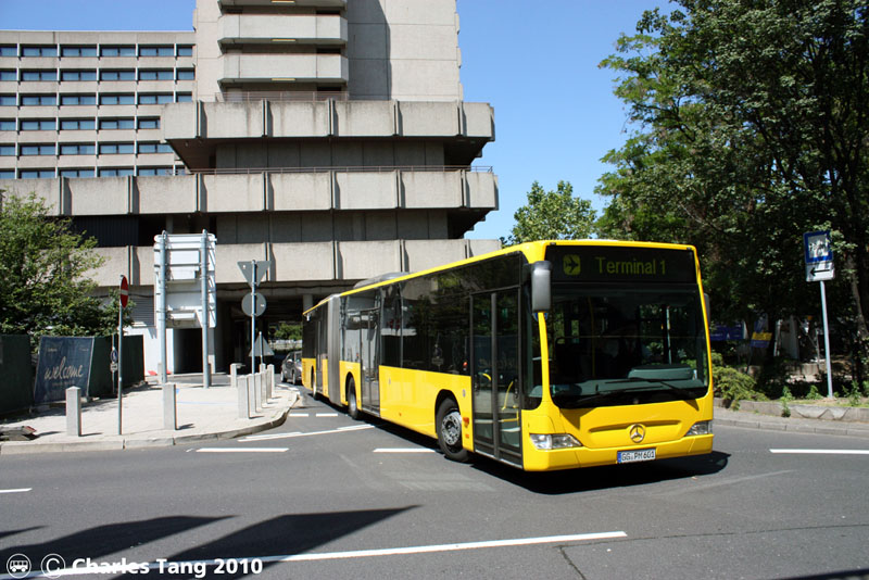 Seit dem 01.06.2010 verkehrt Müller, ein Reisebüro und Omnibusbetrieb aus Riedstadt, derzeit mit drei Gebrauchtfahrzeugen aus dem Mercedes-Benz Omnibus Gebrauchtwagen Center (OGC). Dabei handelt es sich im einzelnen um zwei MAN A23 sowie einen EvoBus MB O 530 G. Zumindest die beiden MAN-Gelenkbusse stammen offenbar aus Berlin. Die beiden A23 tragen die Kennzeichen GG-PM 612 und GG-PM 613, der Citaro G trägt das Kennzeichen GG-PM 601. Die Aufnahmen vom 05.06.2010 entstanden an der Ausfahrt des Busbahnhofs am Frankfurter Flughafen Terminal 1. Da die Ausschreibung und deren Auswertung bis hin zur Vergabe in einem relativ kurzem Zeitraum stattfand, konnte der neue Betreiber noch keine Neufahrzeuge anschaffen, diese sind jedoch bestellt und sollen im Laufe des Jahres noch eintreffen.